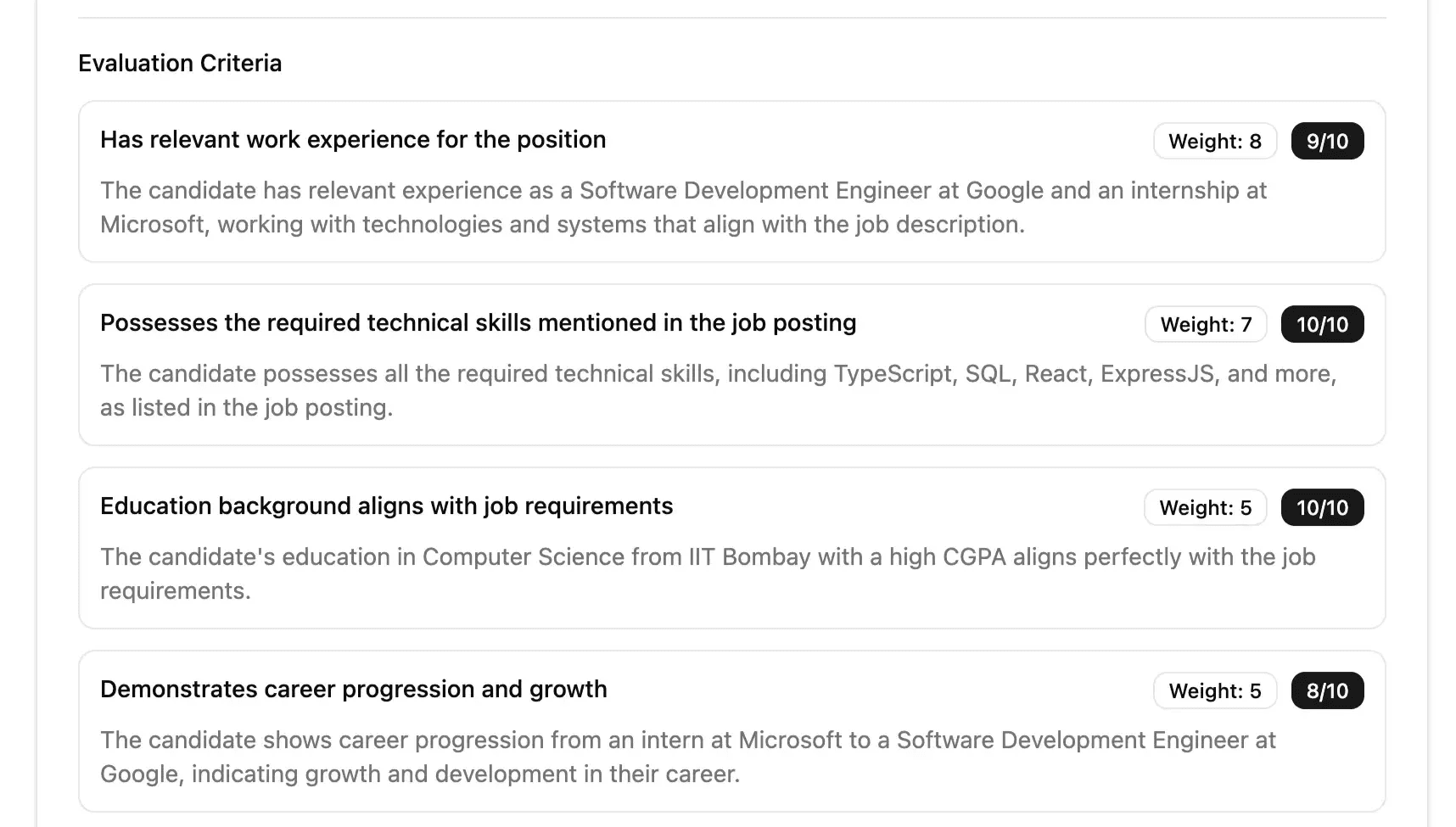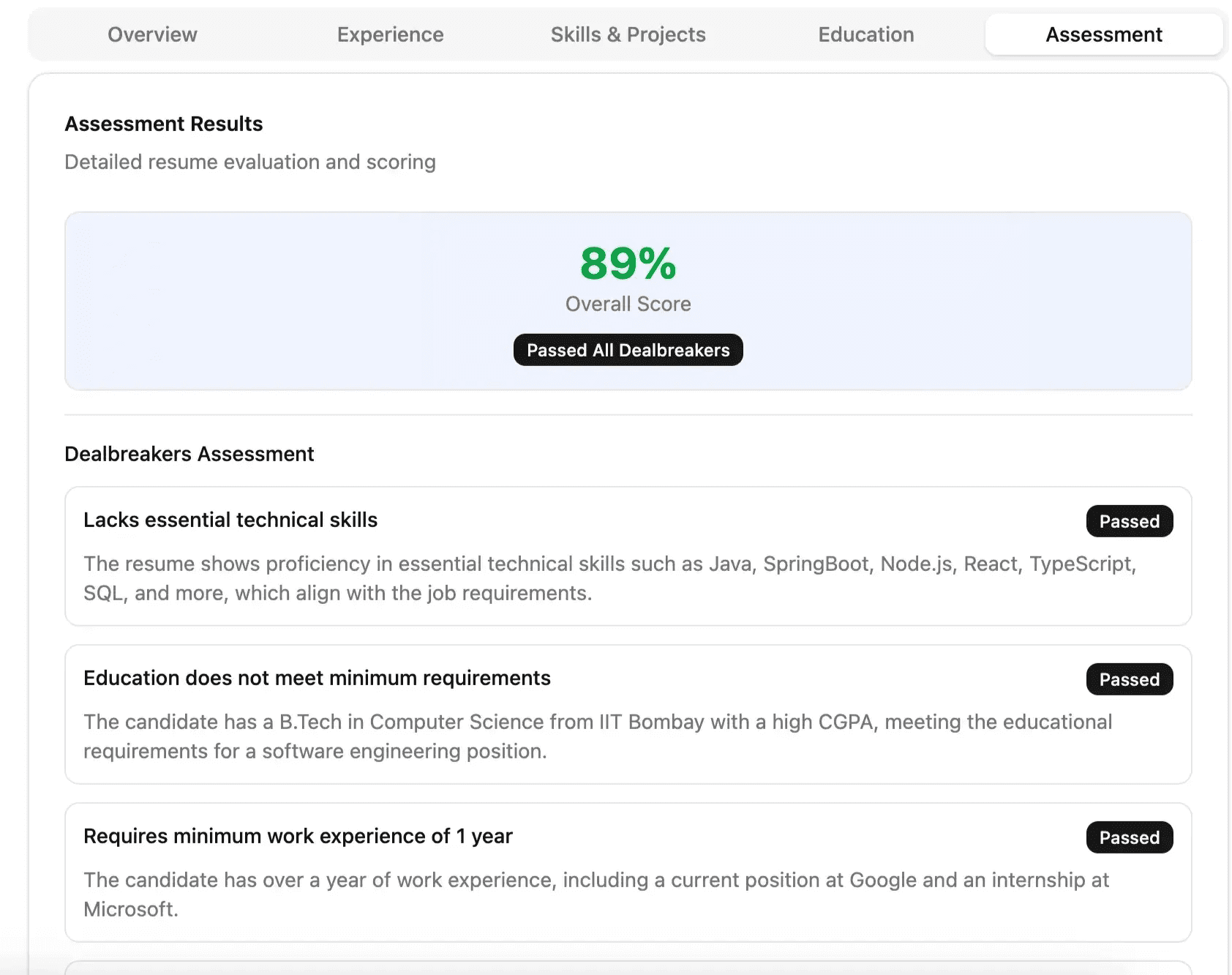 Critical requirements, certifications, tech stack, and domain experience, are validated automatically.