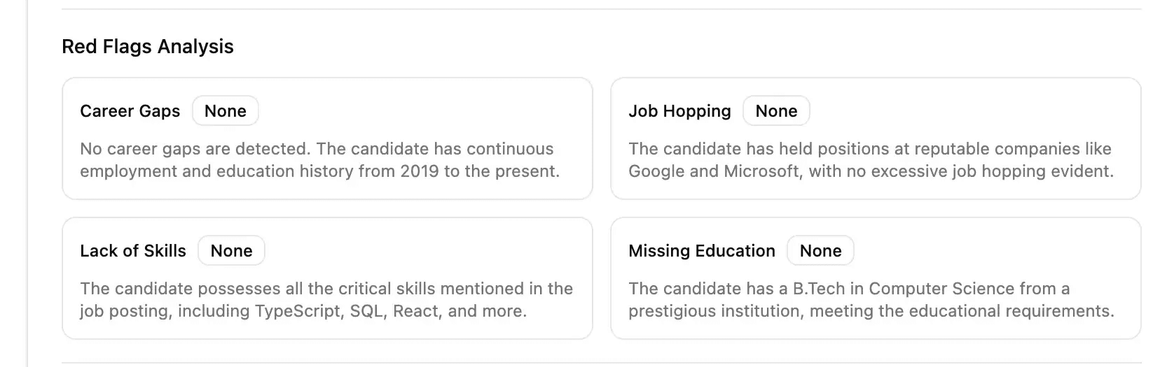 Career gaps, job hopping, missing education, or lack of skills, our AI detects and contextualizes these red flags instantly. It doesn’t judge; it informs.