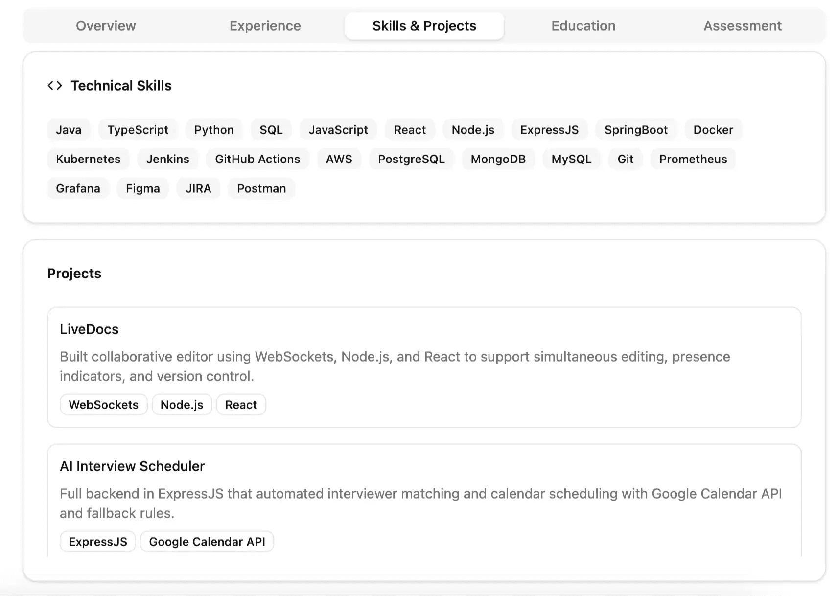 Instead of simply spotting Java, SpringBoot, React, TypeScript, Node.js, SQL, or ExpressJS. Our AI analyzes how and where the candidate actually used these technologies in projects, teams, or problem-solving contexts.