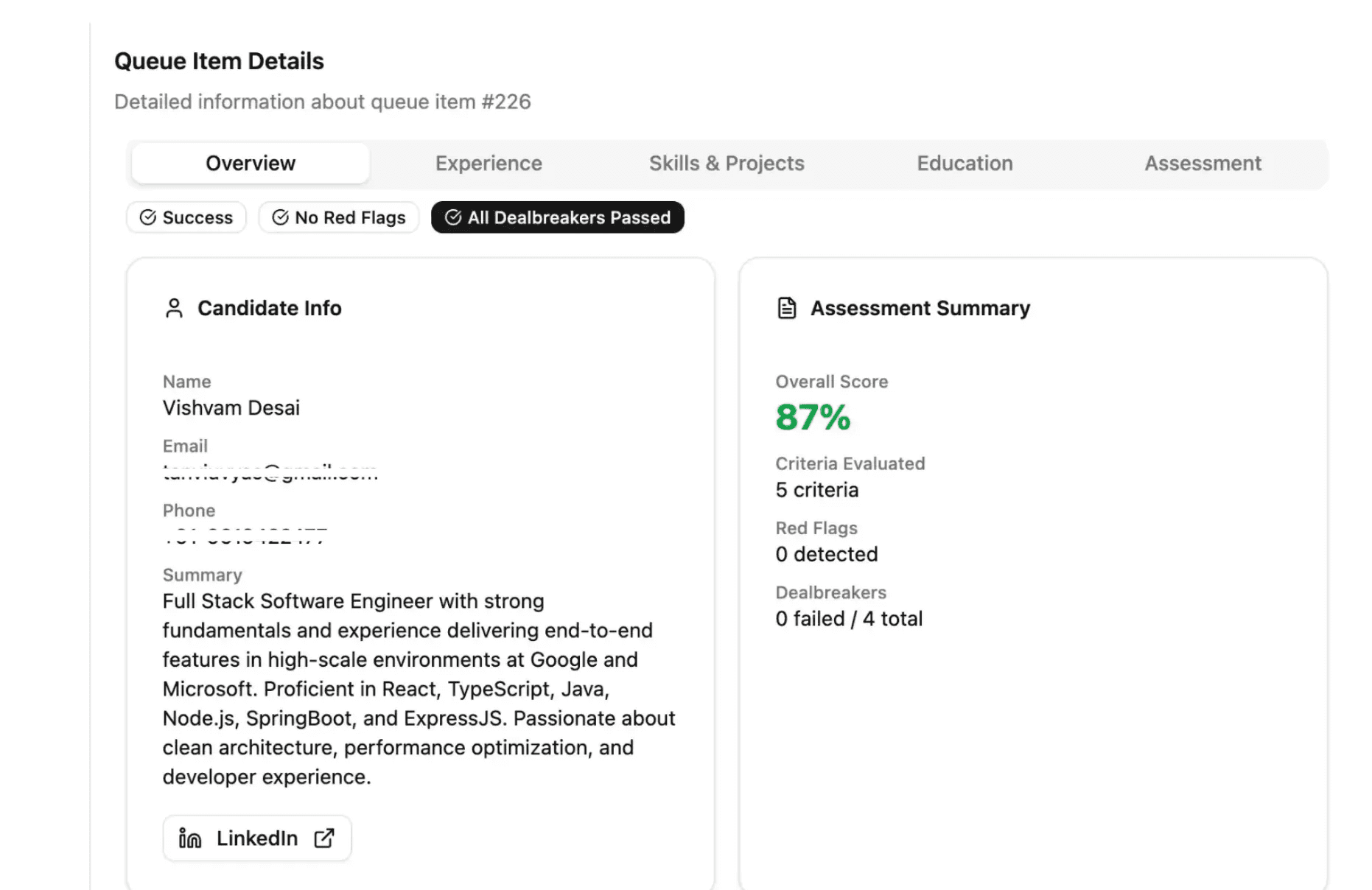 To show the depth of our approach, let’s look at how the system evaluated a software engineer named Vishvam Desai.