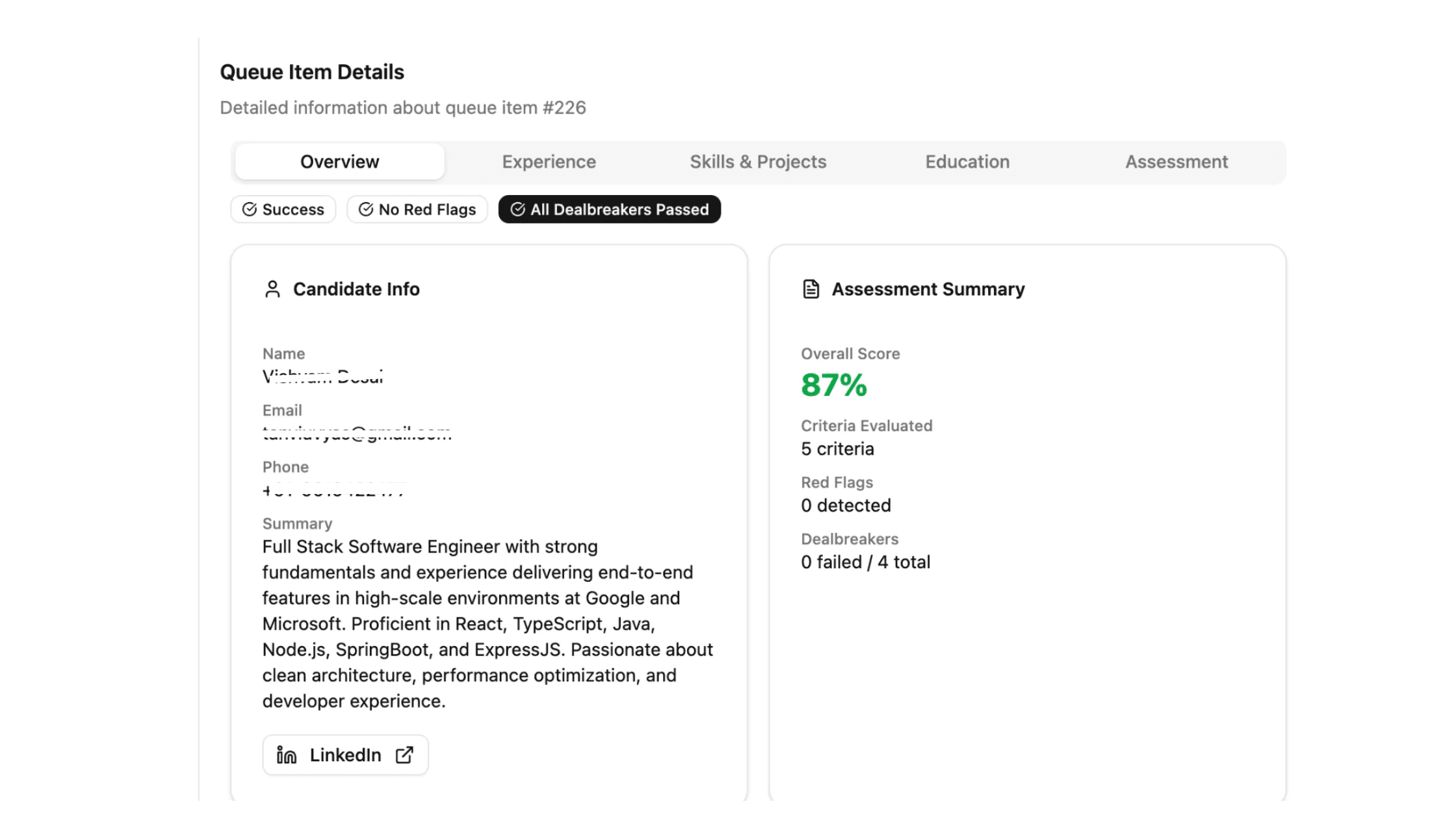 Dealbreaker assessment provides transparent rejection reasoning, helping recruiters understand filtering decisions and maintain compliance with fair hiring practices. Candidates who pass dealbreaker screening advance to comprehensive evaluation, while those who fail receive immediate elimination with documented reasoning.